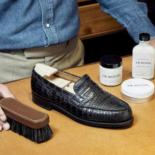 Vous venez d’acquérir une paire de chaussures J.M. Weston, son avenir est entre vos mains. Un entretien régulier permet de préserver leur souplesse et de sublimer leur apparence. Voici les quatre étapes essentielles pour prendre soin de vos chaussures J.M. Weston en cuir exotique.